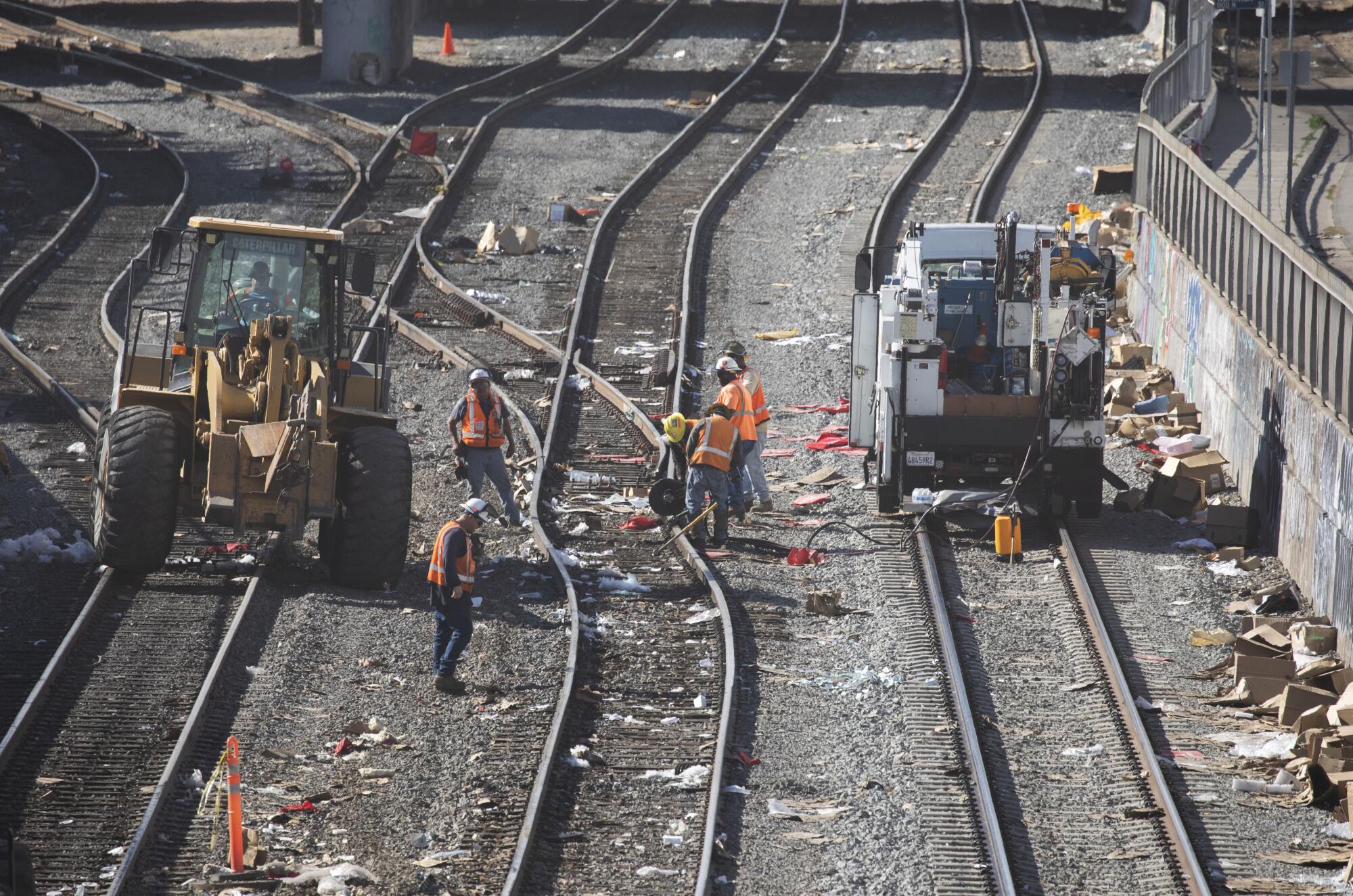 Photos: Gov. Newsom bags trash along railroad tracks littered with